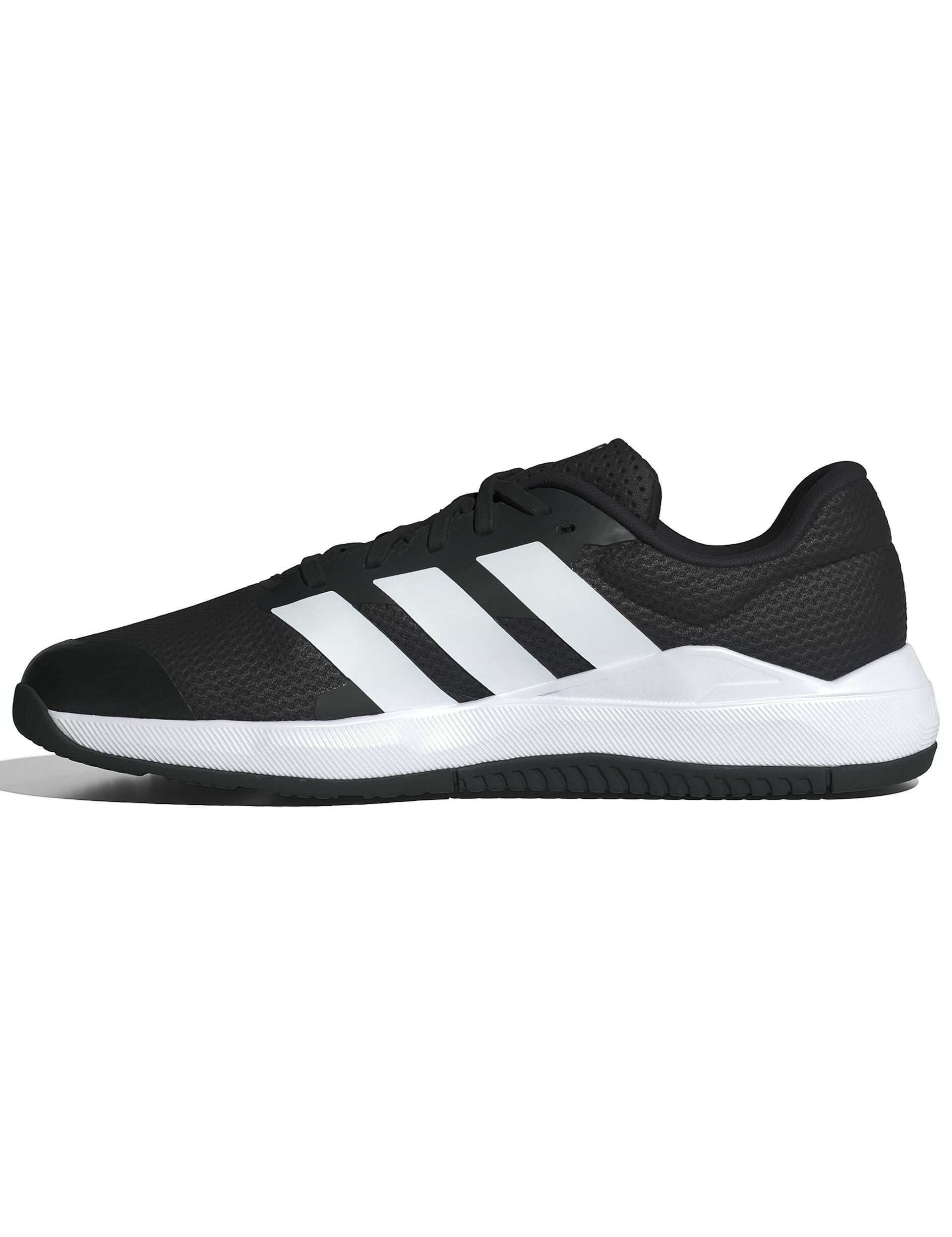 Push your limits in the weight room with the Adidas Dropset Base Training Shoe. Designed for strength workouts, these shoes feature a low-to-the-ground build and a multi-directional lug-pattern outsole to keep you stable and in control during explosive moves and heavy lifts. The breathable mesh upper is reinforced for added support, ensuring you feel grounded and confident.