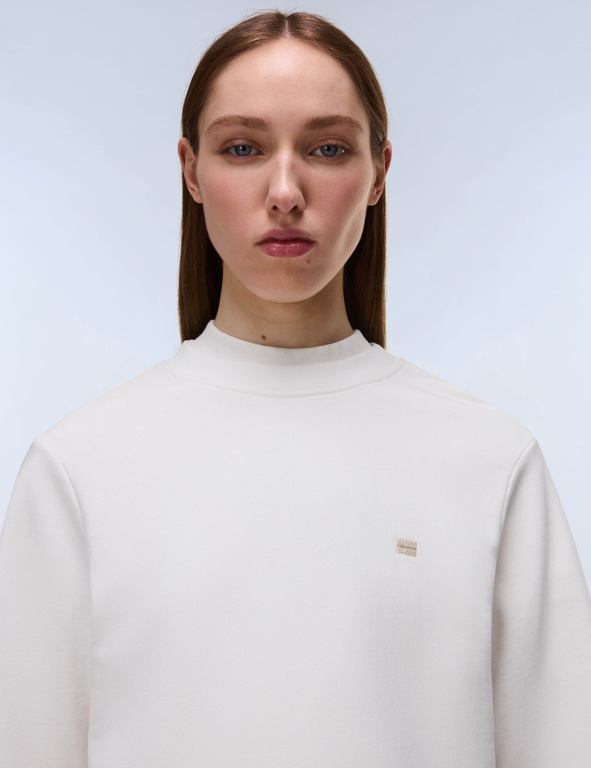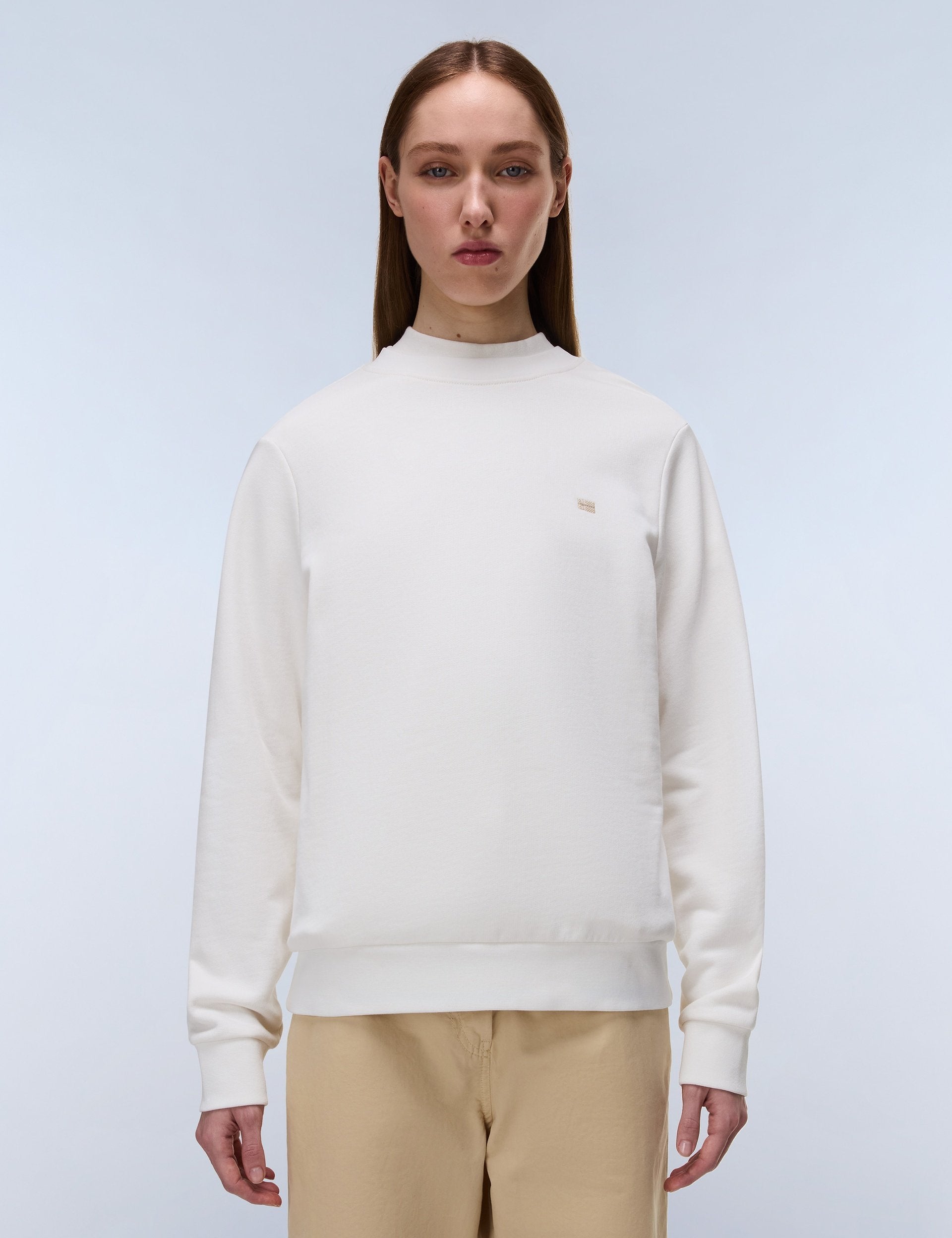Crafted primarily from soft cotton, the Aurora Crew Neck Sweatshirt in White Whisper offers warmth and comfort for women. It features ribbed trims for a classic fit and signature Napapijri embroidery on the left chest for a distinctive touch.