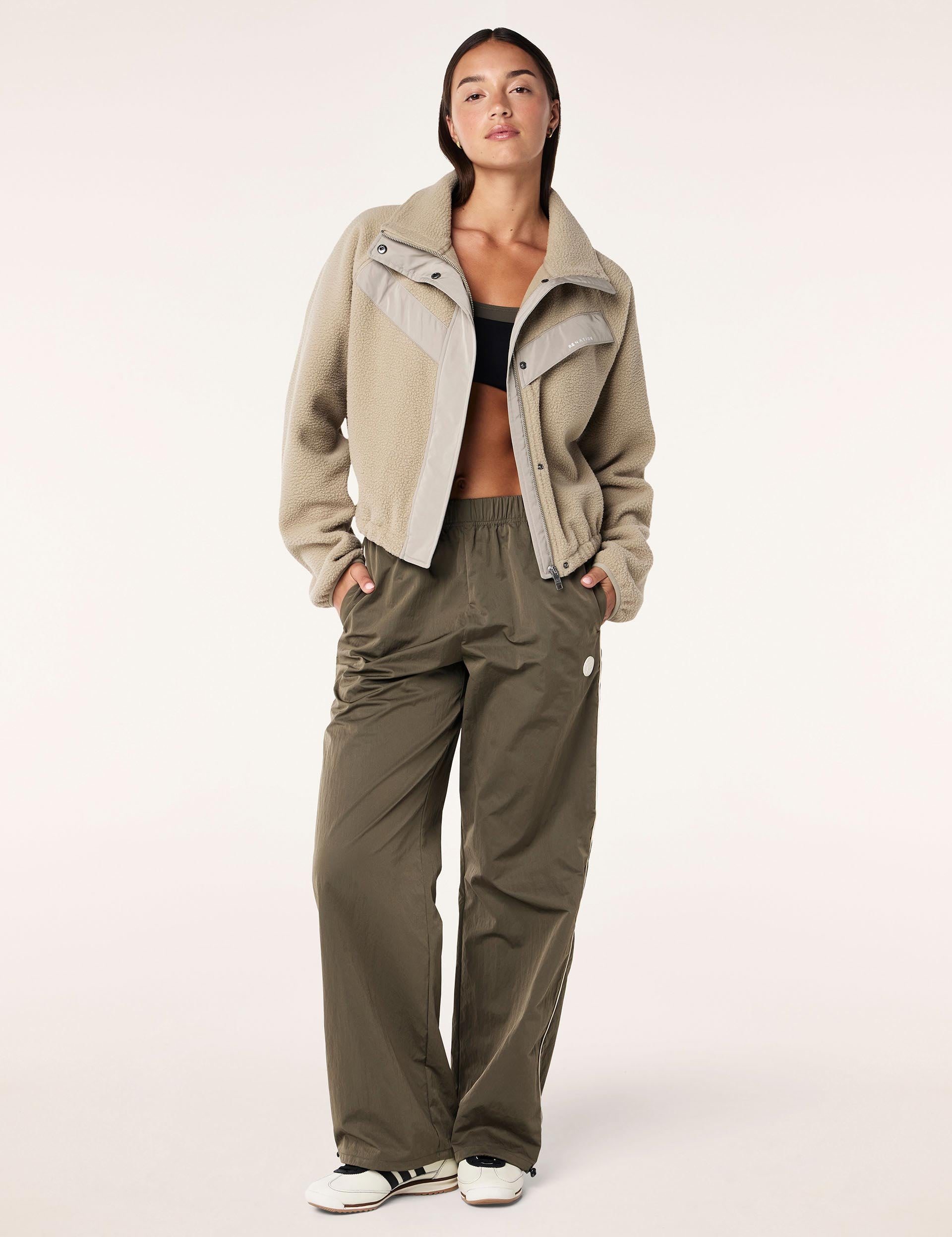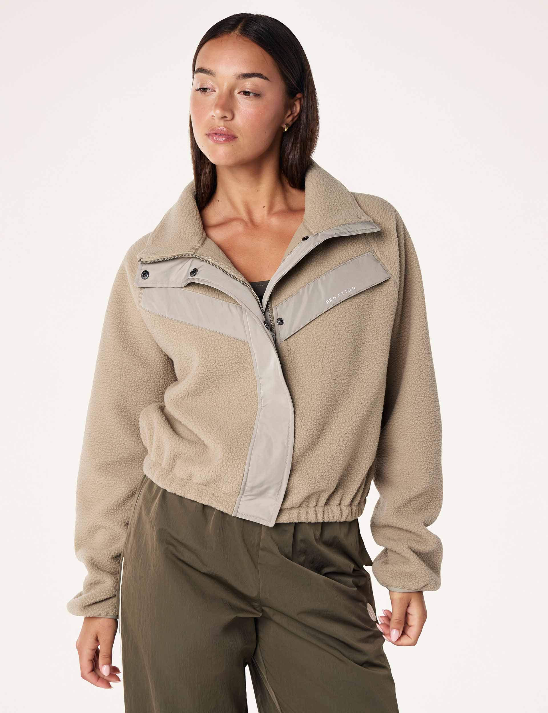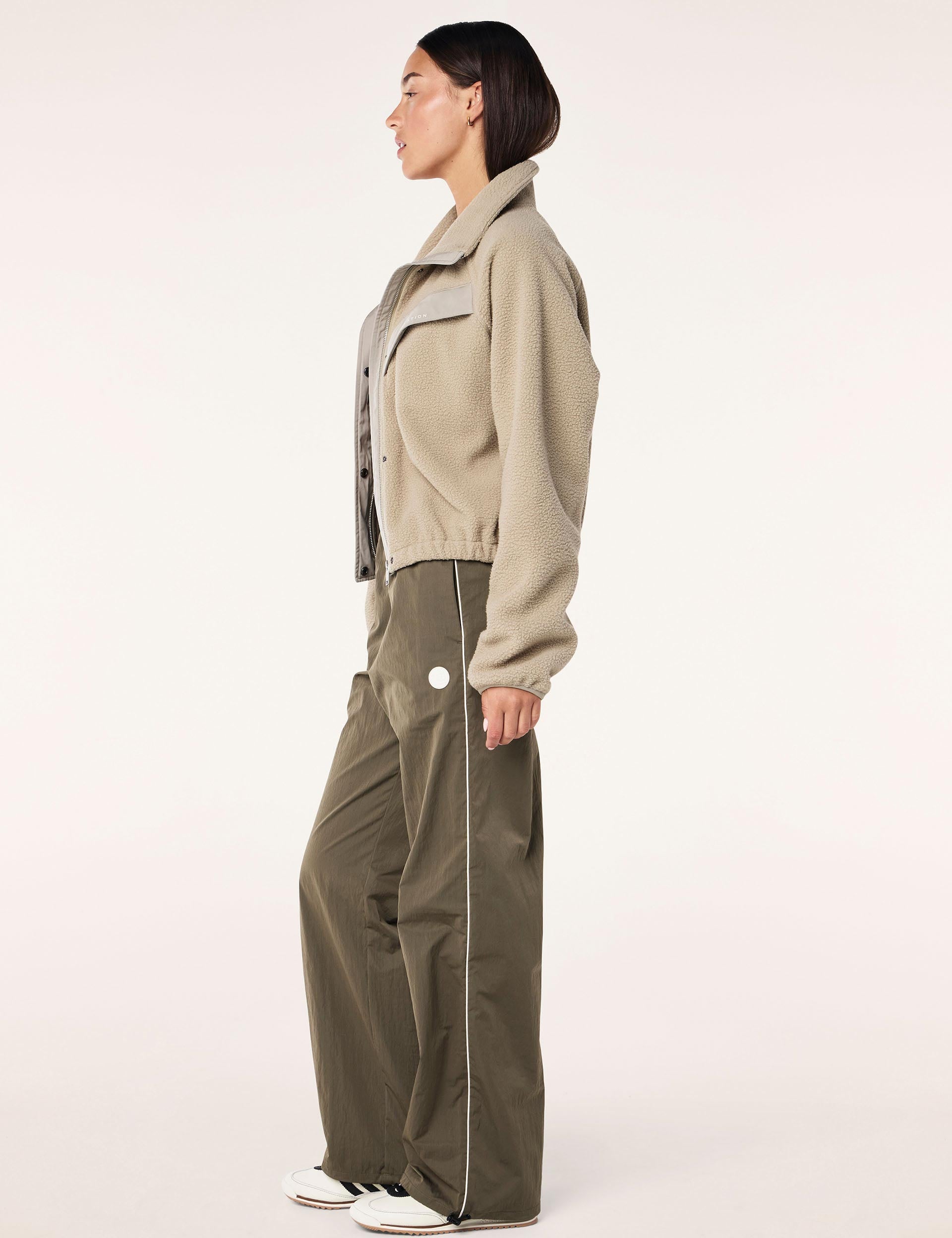 Wrap up the cropped Shelter Sherpa Jacket featuring chevron panelling. Its packable hood and hidden chest pocket add functionality to your cosy layers, making it adventure-ready and effortlessly cool.