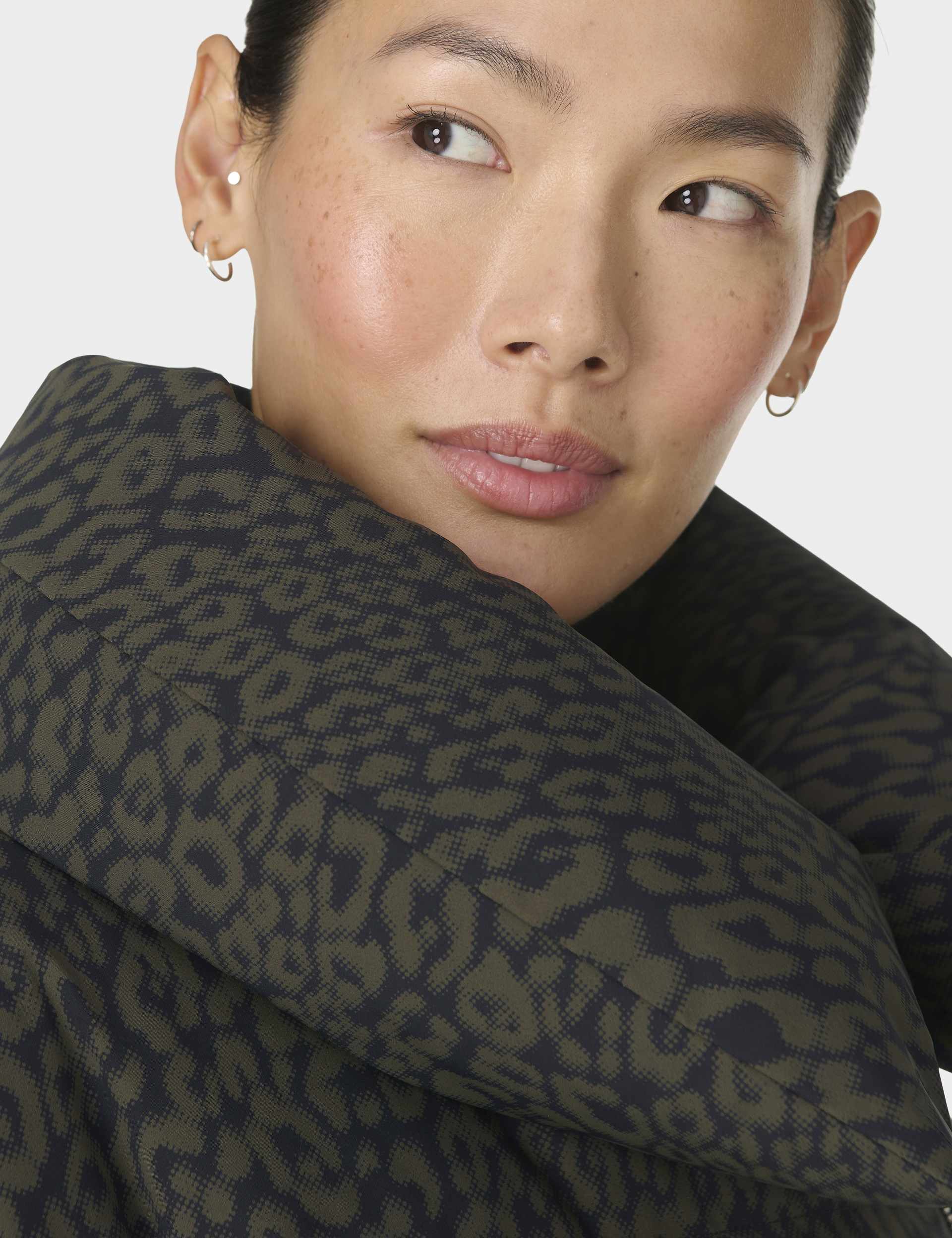 Brave the elements in style with the Nimbus Cloud Short Puffer in Large Green Leopard Print. This warm winter jacket is engineered to meet your daily demands with a water-resistant and windproof fabric. Featuring a cosy wrap-over funnel neck and warm down filling, it offers superior protection and comfort on chilly days.