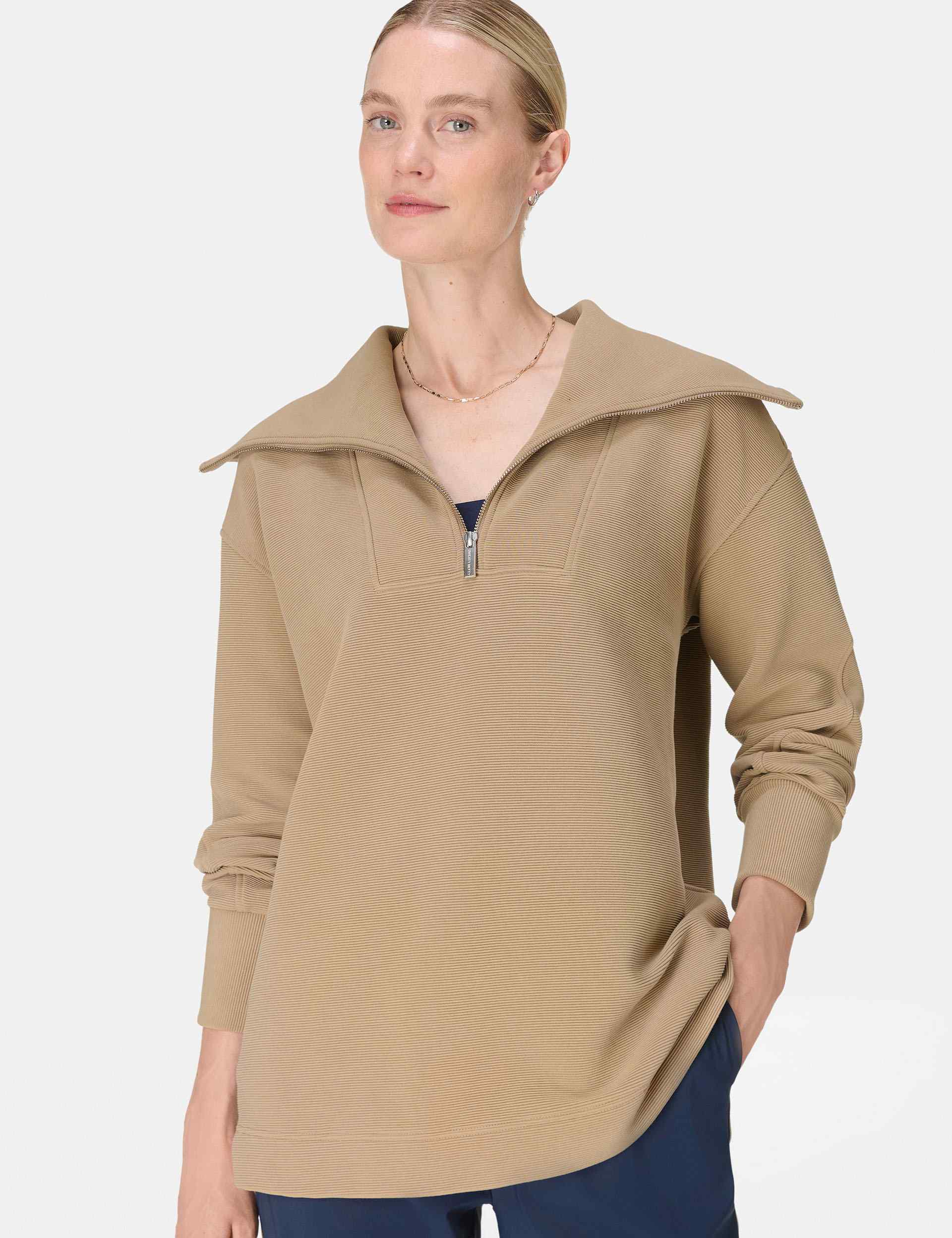 Unwind in the Peaceful Rib Half Zip Sweatshirt, designed with a throw-on, boxy design with a longline silhouette for off-duty comfort. A funnel neck, half-zip, and contrast rib detailing create a chic, high-low hem look, perfect for lounging or grabbing a coffee. Lightweight and cosy, it's made for all-day comfort.